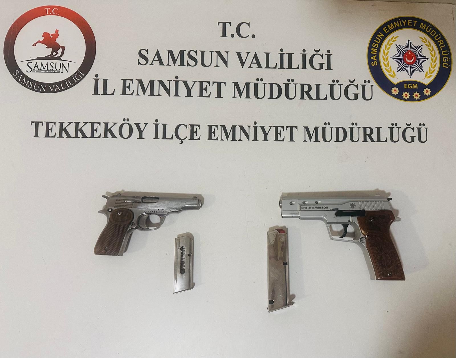Edinilen bilgiye göre, samsun Emniyet Müdürlüğü, tekkeköy İlçe Emniyet Müdürlüğü elipleri rutin kontrolleri sırasında iki şüpheli üzerinde arama yaptı. Kontroller esnasında, H.Ü. adlı şahsın üzerinden bir adet ruhsatsız Smith & Wesson marka tabanca, B.T. adlı şahsın üzerinden ise bir adet ruhsatsız 7,65 çapında Browning marka tabanca bulunarak el konuldu.