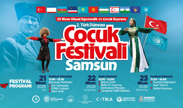 Samsun Büyükşehir Belediyesi öncülüğünde düzenlenen 2. Samsun türk dünyası Çocuk Festivali, 19-25 Nisan 2026 tarihleri arasında gerçekleştirilecek. Samsun Valiliği, Samsun İl Milli Eğitim Müdürlüğü, Türk Dünyası Araştırmaları Vakfı, Yunus Emre Enstitüsü, Türk İş birliği ve Koordinasyon Ajansı Başkanlığı (TİKA) ve Gençlik ve Spor İl Müdürlüğü olmak üzere birçok kurum ve kuruluşun destekleriyle hayata geçirilen festival, Türk Dünyası’nın dört bir yanından gelen çocukları aynı çatı altında buluşturacak.